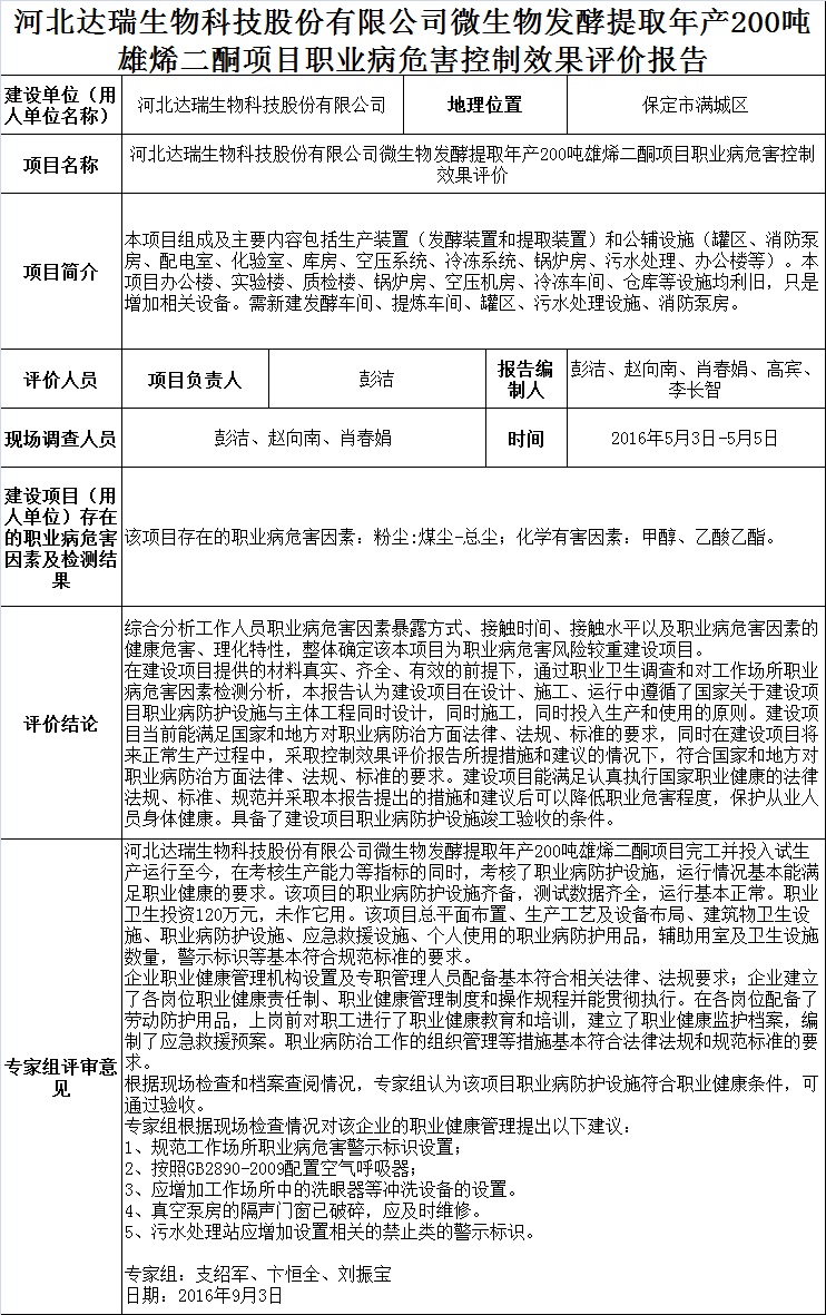 河北达瑞生物科技股份有限公司微生物发酵提取年产200吨雄烯二酮建设项目职业病危害控制效果评价