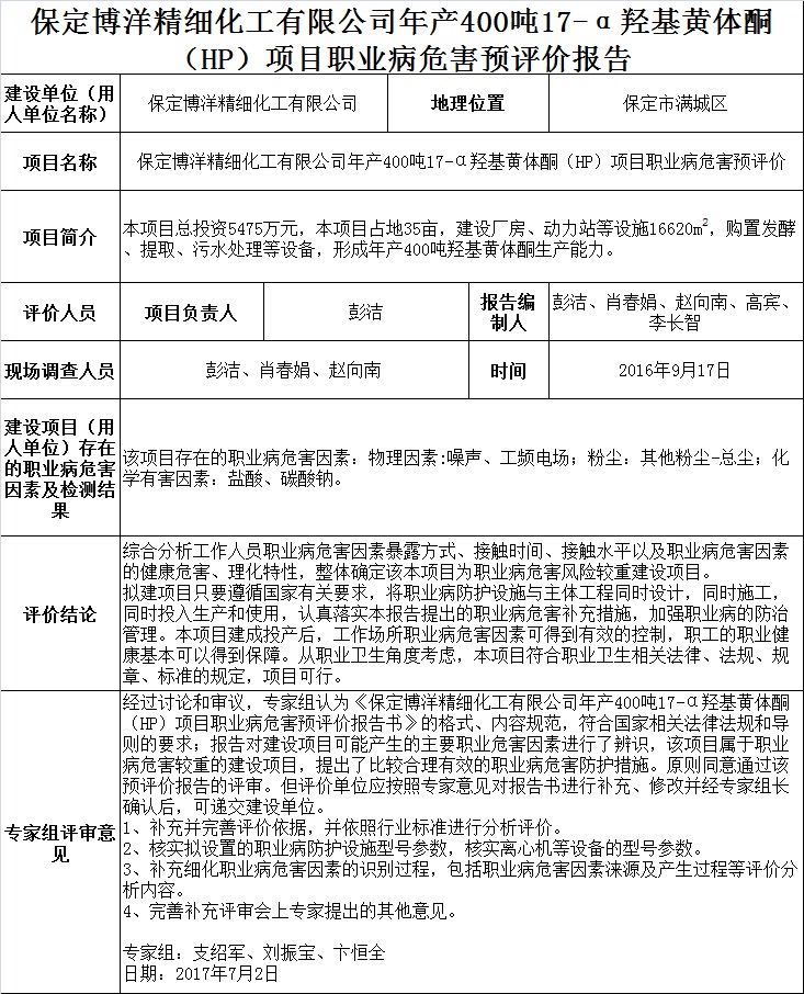 保定博洋精细化工有限公司年产400吨17-α羟基黄体酮(HP)项目职业病危害预评价