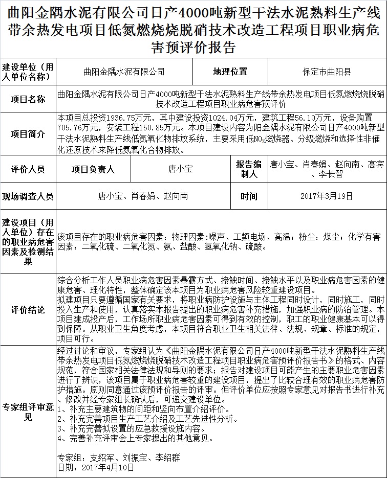 曲阳金隅水泥有限公司日产4000吨新型干法水泥熟料生产线带余热发电项目低氮燃烧烧脱硝技术改造项目职业病危害预评价